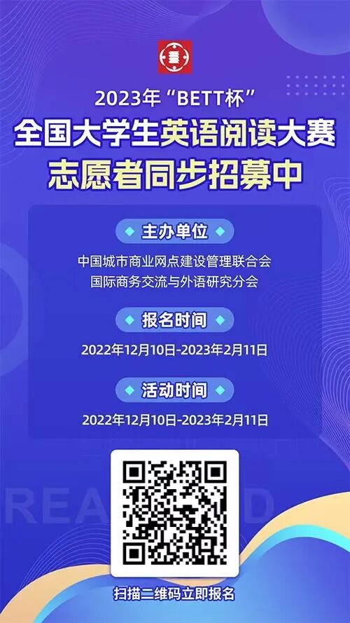 为贯彻落实教育部《关于加快建设高水平本科教育 全面提高人才培养能力的意见》等文件精神,激发大学生学习外语的兴趣,服务国家战略发展,担当铸魂育人使命,中国城市商业网点建设管理联合会国际商务交流与外语研究分会(以下简称“中国城商联外研分会”)特举办2023年“BETT杯”全国大学生英语阅读大赛。